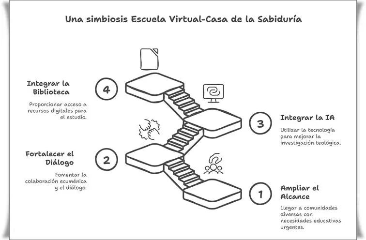 • El cuarto es la plena integración de los miembros de la Escuela en la Casa de la Sabiduría, la Biblioteca Digital de las CEB, donde se ha creado un espacio exclusivo para ellos. Con los recursos de este proyecto, de manera privada podrán trabajar en estrategias de investigación y estudio con instrumentos basados también en el uso de la IA, conducidos por los tutores de la Escuela.